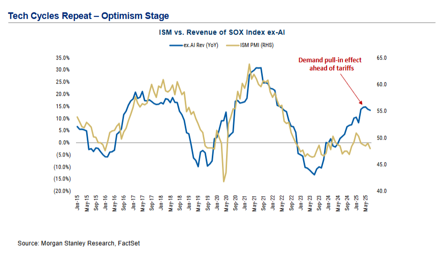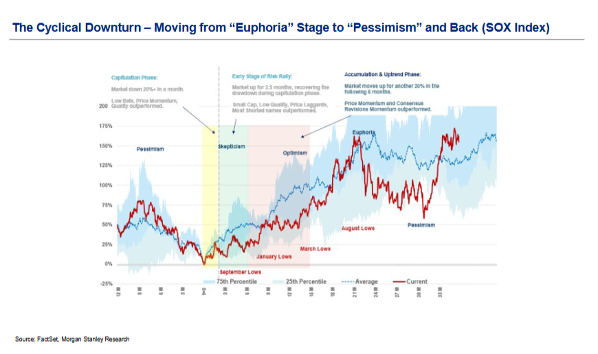 从历史上看,费城半导体指数(SOX Index)的走势呈现出从“狂热”到“悲观”再回归的循环,而当前市场正处于“乐观阶段”。