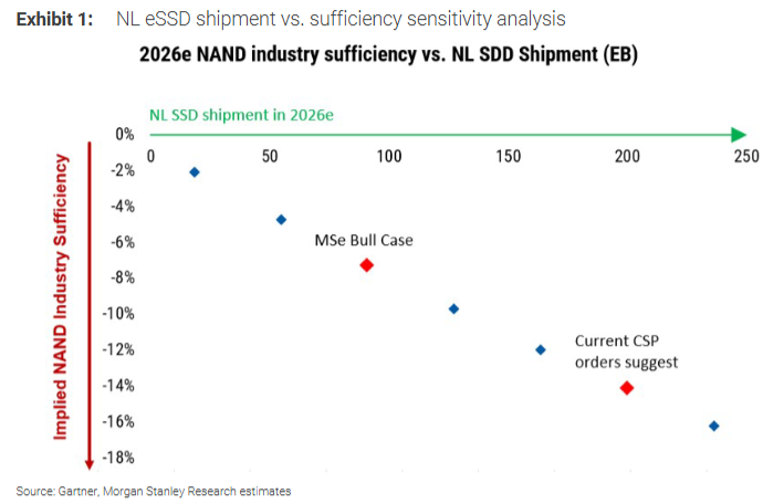 尽管市场对“重复下单”存在担忧,但大摩认为,即便在其最乐观的模型中,假设2026年NL eSSD出货量仅为90EB,届时市场仍将面临7%的供应缺口。任何超出此数字的需求都将进一步增强供应商的定价能力。