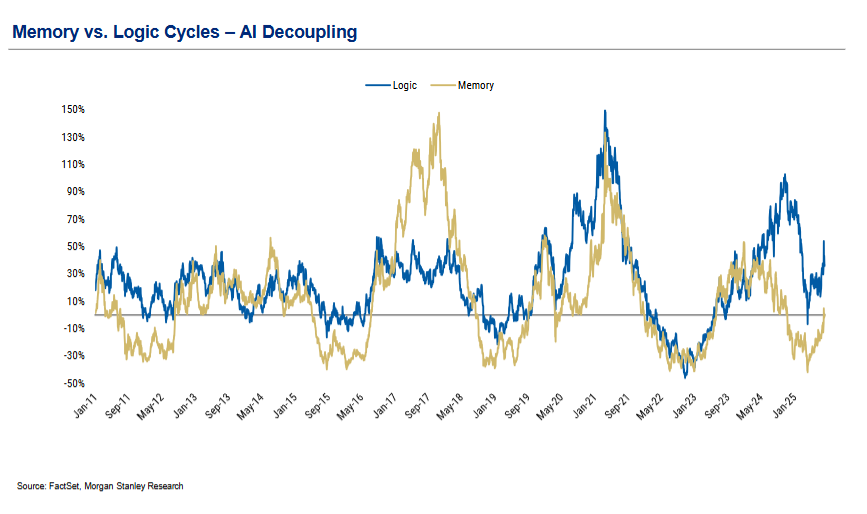 报告中的图表显示,内存周期与逻辑芯片周期在AI时代出现了脱钩,但现在正显示出追赶的迹象。