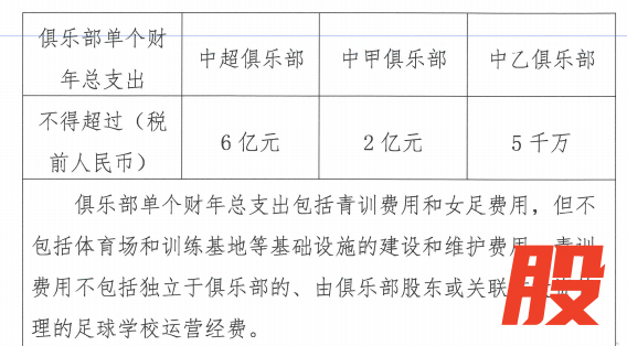 首先是在总支出限额上,中超俱乐部单个财年总支出不得超过6亿元(税前),中甲不得超过2亿元(税前),中乙不得超过5千万元(税前)。总支出包括青训费用和女足费用,但不括体育场和训练基地等基础设施的建设和维护费用。青训费用不包括独立于俱乐部的、由俱乐部股东或关联方投资管里的足球学校运营经费。