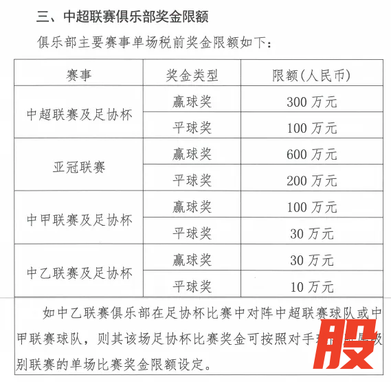 在单场奖金限额方面,中超联赛的单场赢球奖金不得超过税前300万元,平球奖金不得超过税前100万元。亚冠联赛单场赢球奖金不得超过税前600万元,平球奖金不得超过税前200万元。中甲联赛及足协杯单场赢球奖金不得超过税前100万元,平球奖金不得超过税前30万元。中乙联赛及足协杯单场赢球奖金不得超过税前30万元,平球奖金不得超过税前10万元。